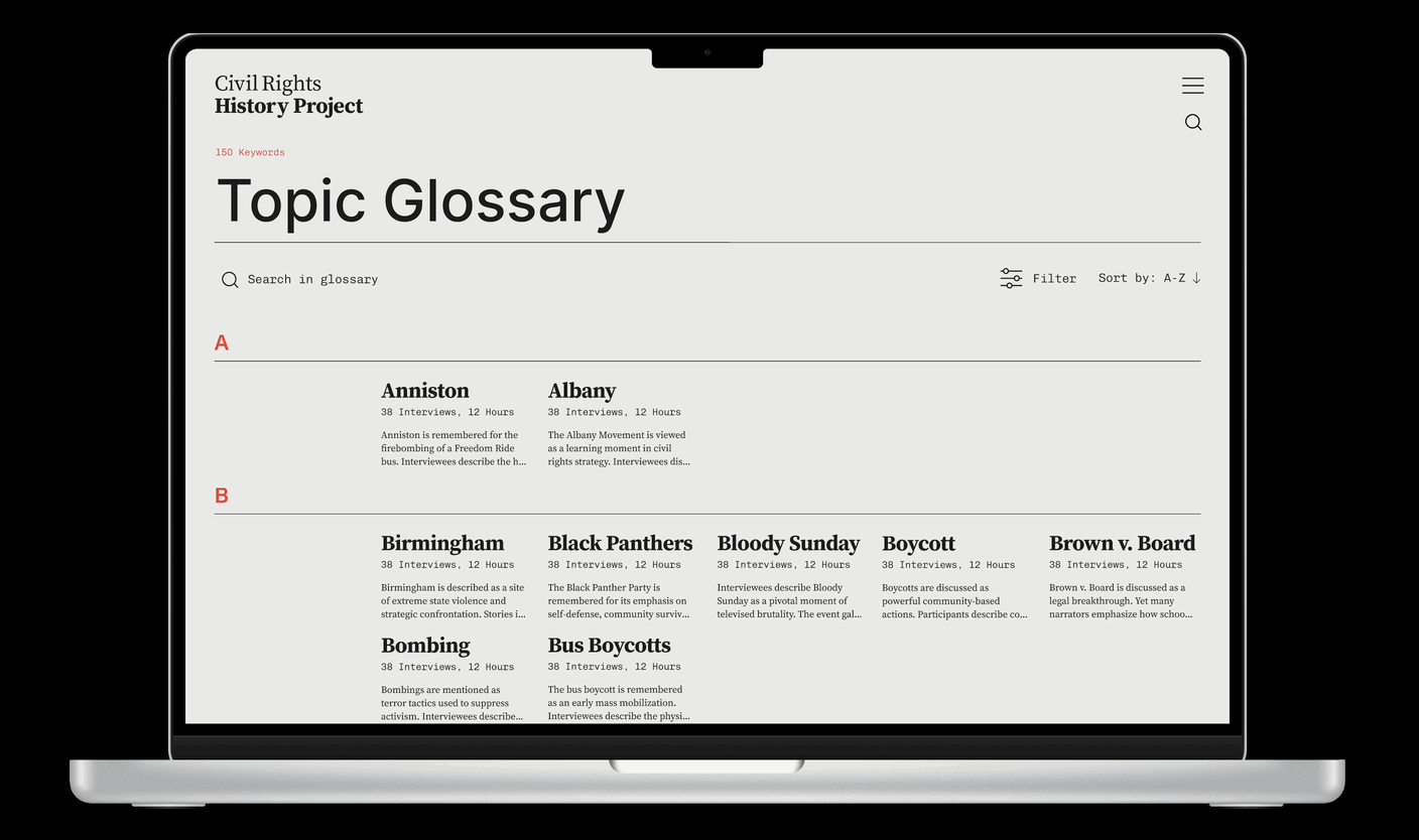 The glossary contains all the main, frequently discussed topics from the interviews, combining the topic tags seen on other screens into one page. Clicking on a topic in the glossary will bring users to a page that defines the term in the context of the archive and provides relevant quotes and materials.