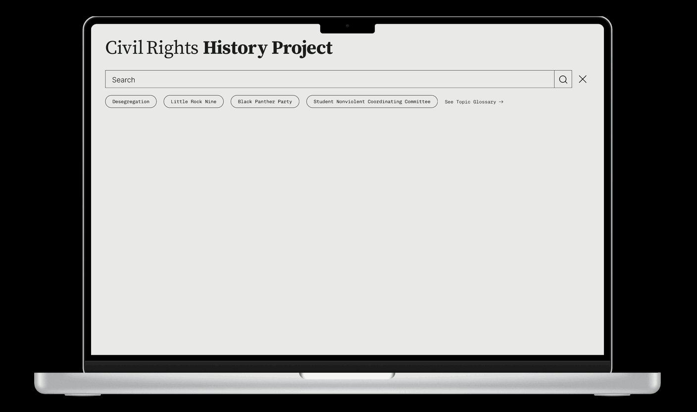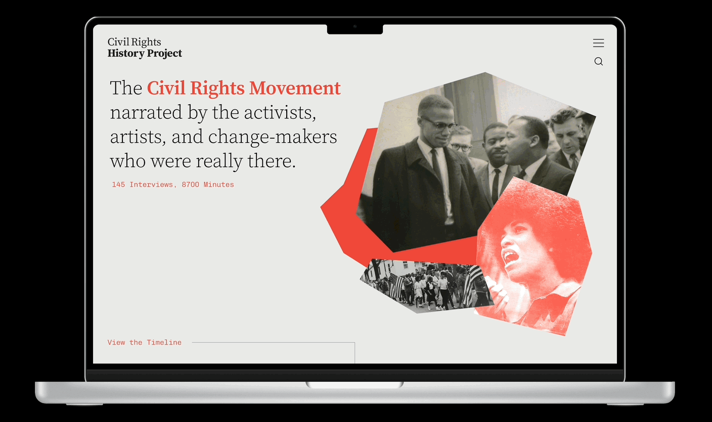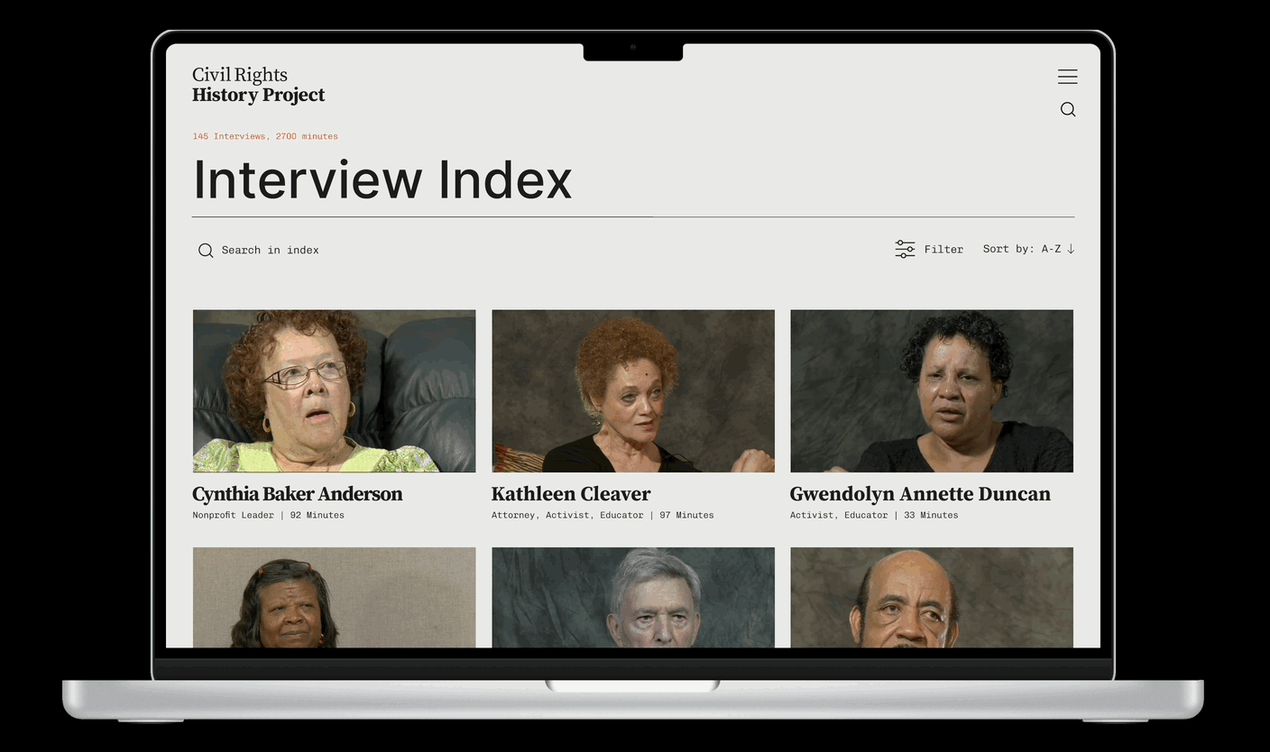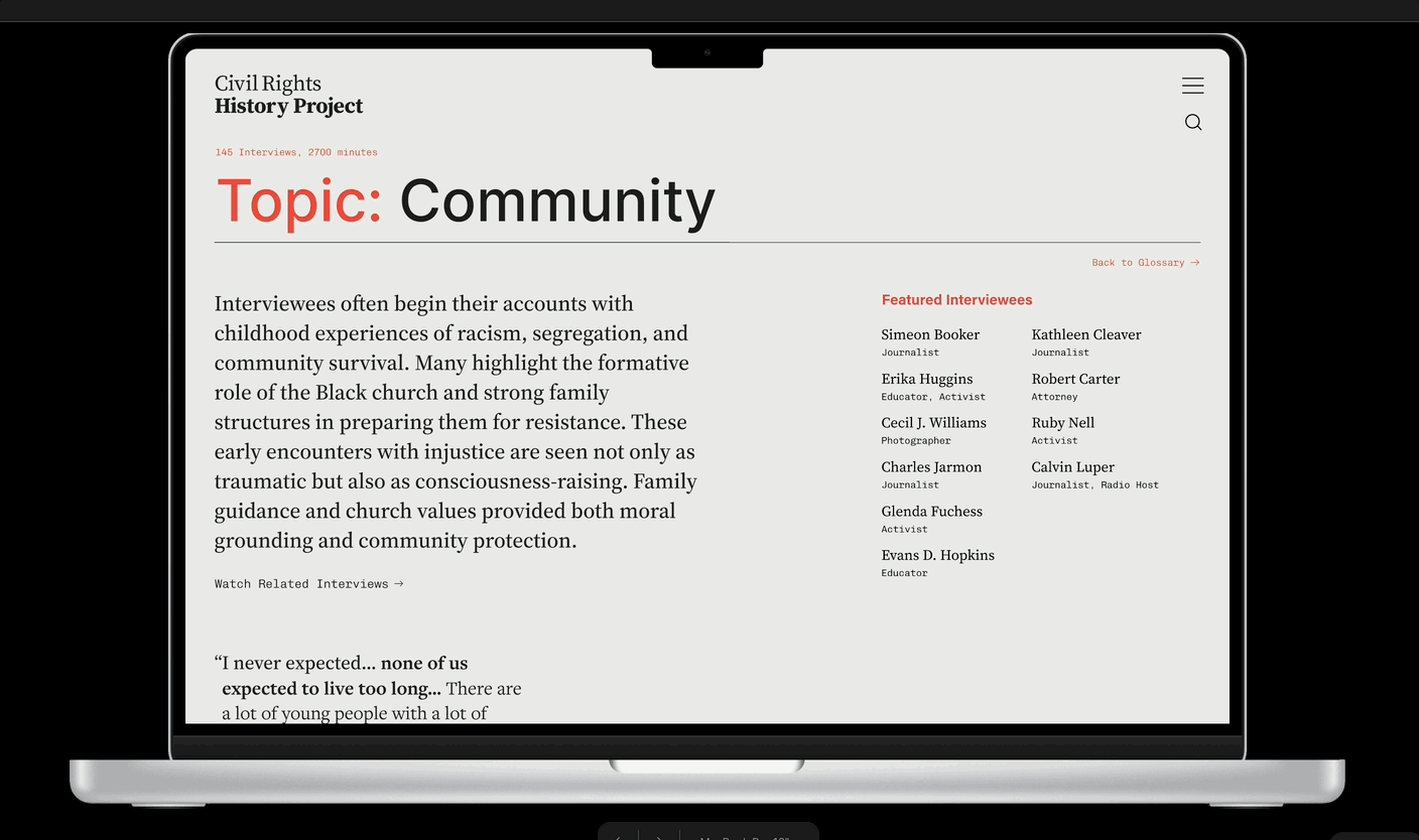 Website interface redesign of the Library of Congress's Civil Rights Oral History Project archive. The redesign was completed as a part of a research project under Professor Dustin O'Hara from the Internet Studies Department at Western Washington University. The project is focused on increasing accessibility in large video archives.