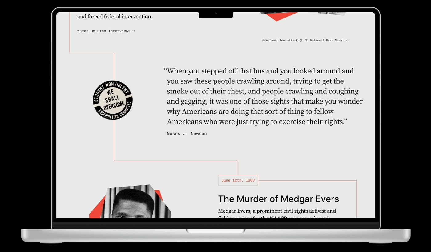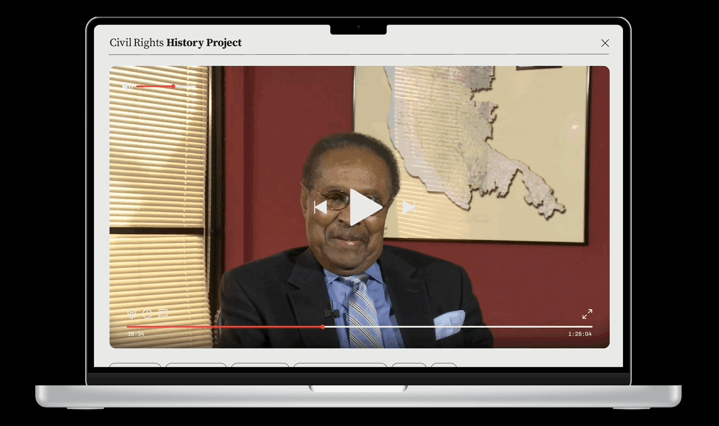 The website landing page is a long-scroll timeline of frequently discussed events from the the archive. It covers important historical moments from the Civil Rights era, accompanied by imagery and emphemera from the time-period. Users can navigate into video playlists that correspond to the specific events in the timeline, and can click through playlists based on event. Interviews within these playlists have been clipped to the portions of the partcipants interview that discuss the event in question.